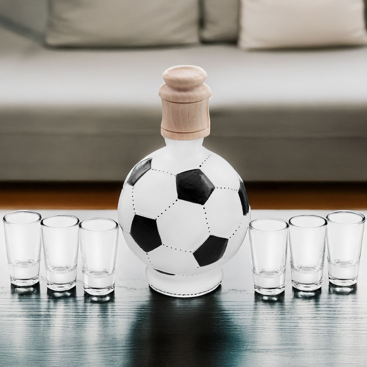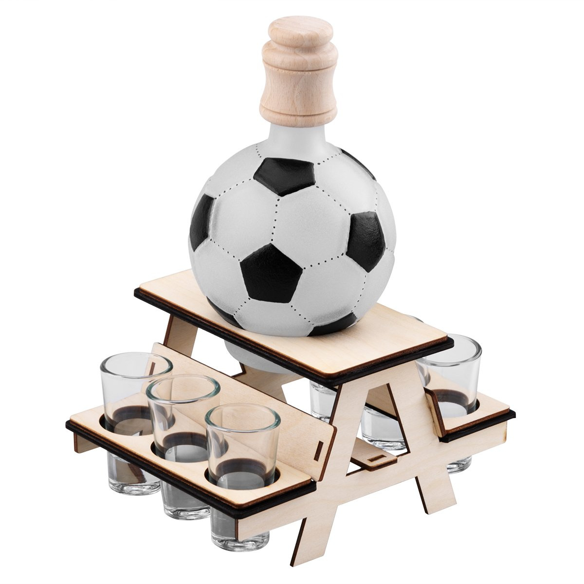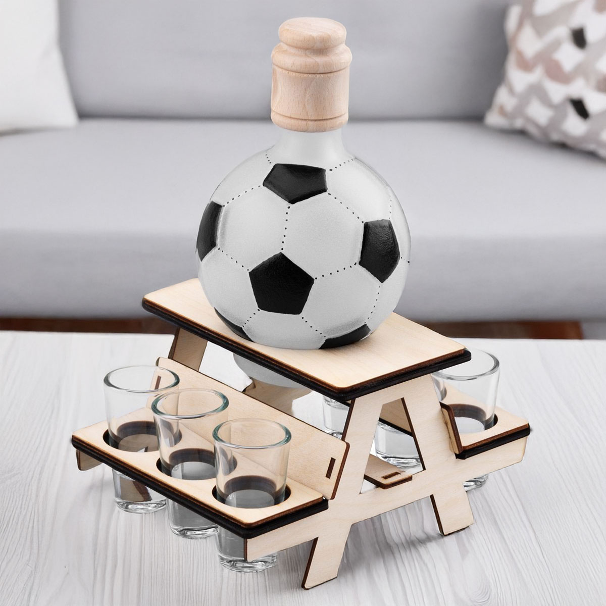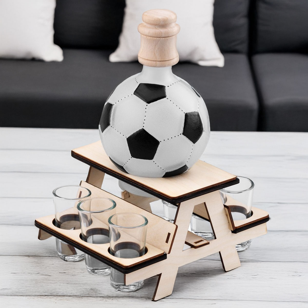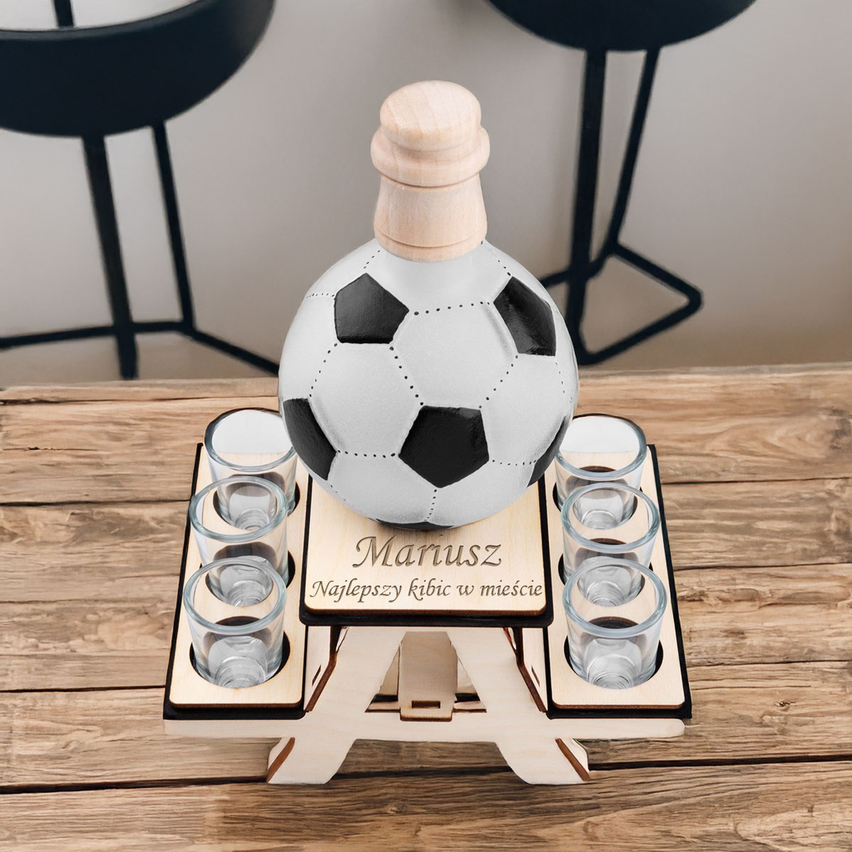 Nasz 7-częściowy komplet do alkoholu to nie tylko naczynie. To stylowa dekoracja, która z dumą zajmie centralne miejsce w salonie, domowym barku lub „męskiej jaskini”. Karafka w kształcie piłki nożnej wykonana jest z dbałością o detale, a dedykowany, drewniany stojak nadaje całości prestiżowego wyglądu.